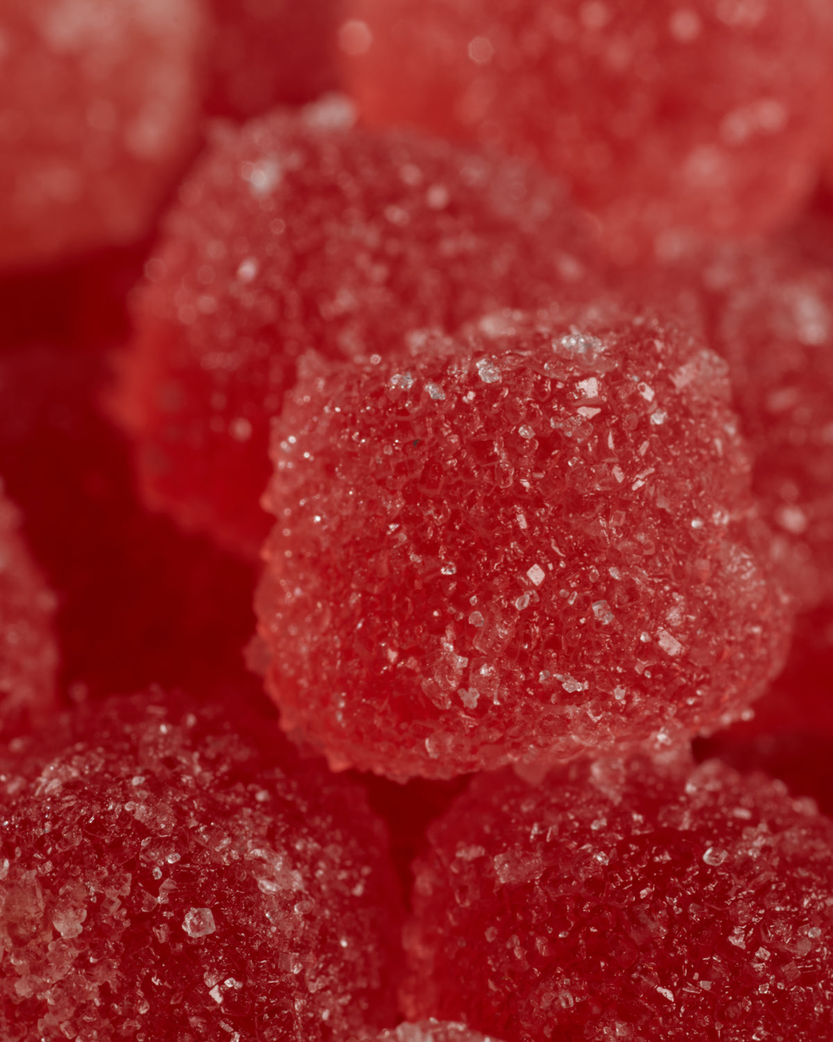 Zucker, Glukosesirup, Früchte 12 % (Apfel- und Erdbeermark), natürliche Aromen. Natürlicher Farbstoff: Anthocyane. Geliermittel: Fruchtpektin. Säuerungsmittel: Zitronensäure.