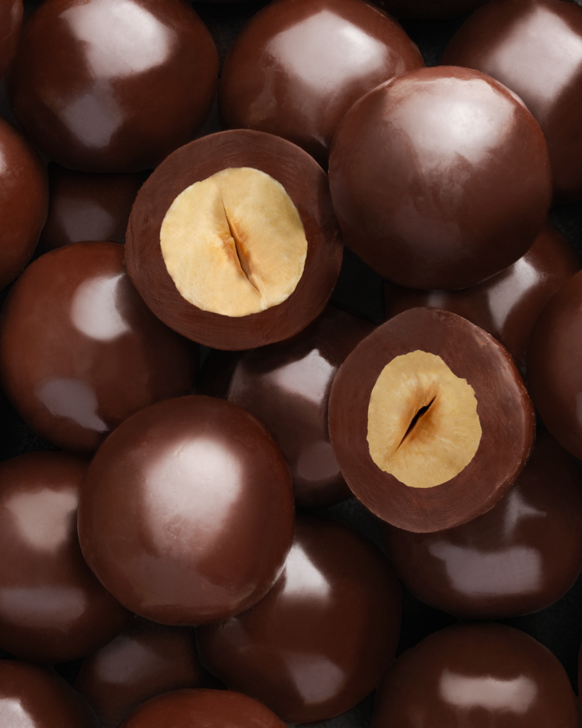Geröstete Haselnüsse, umhüllt von köstlicher Zartbitter- und Milchschokolade, köstliche Kugeln, die bereit sind, Ihre Sinne zu erobern.