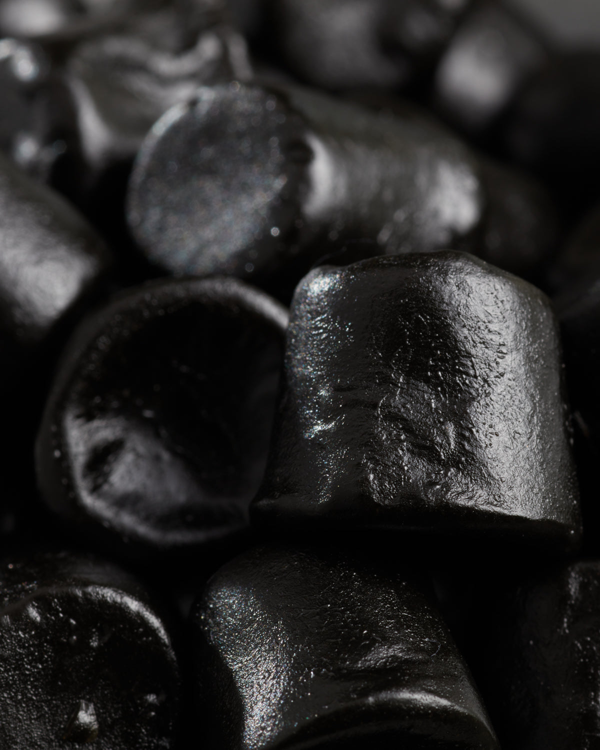 Zutaten: Zucker, Gummi arabicum, Glukosesirup, Süßholzextrakt, Aromen. Natürlicher Farbstoff: Pflanzenkohle. Beschichtungsmittel: Bienenwachs.
