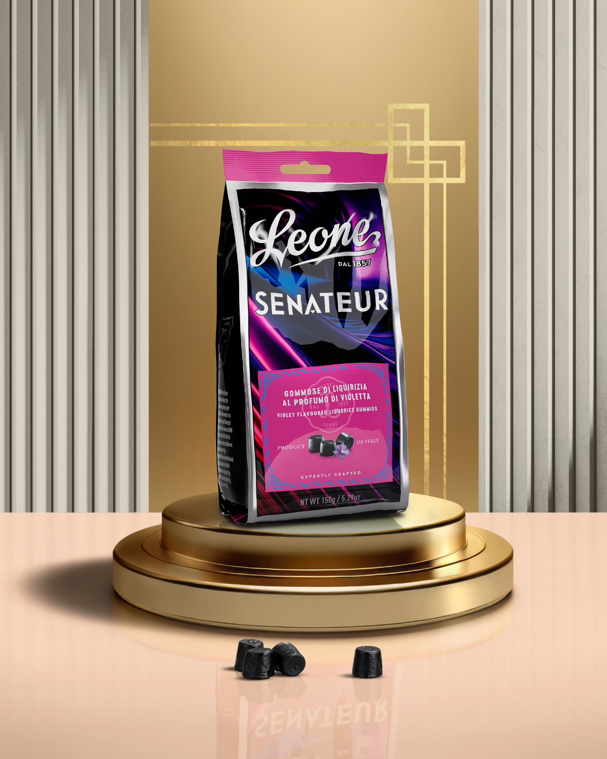 Ein eleganter und praktischer wiederverschließbarer Beutel mit Lakritzgummis mit Veilchenduft.