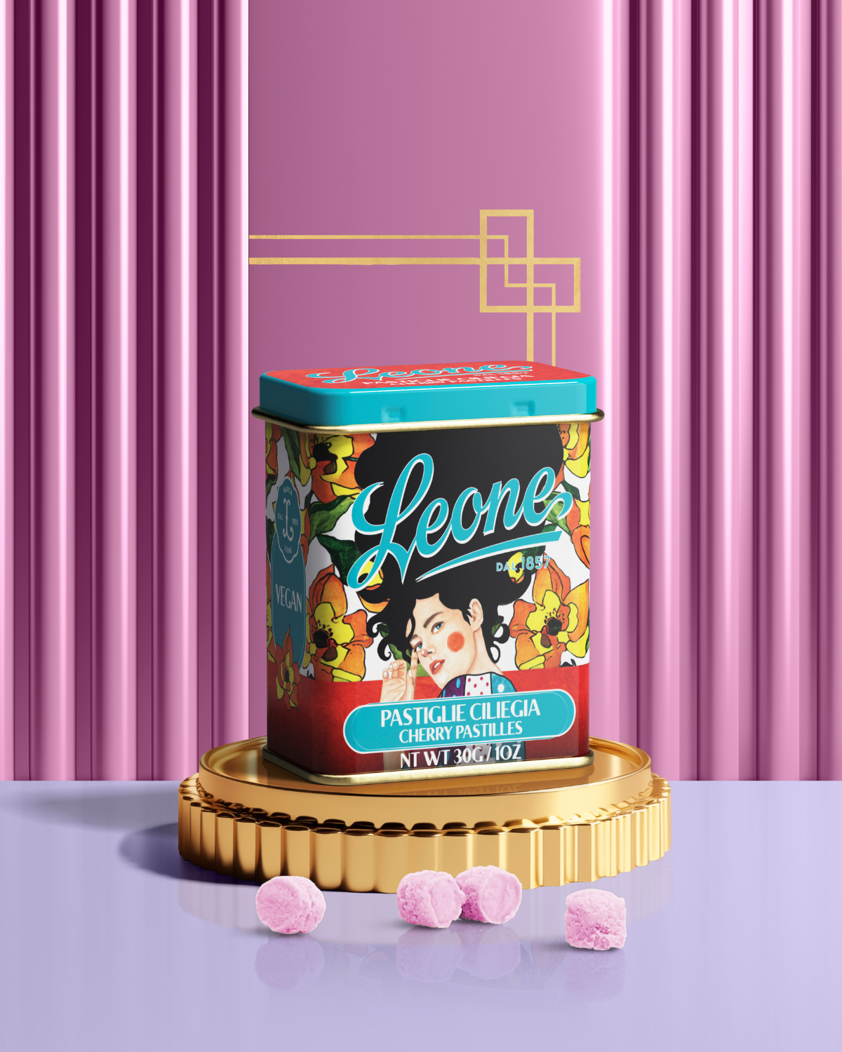 L'art d'Hülya Özdemir habille l'excellence de Leone, transformant cette boîte en un petit chef-d'œuvre de couleur qui renferme tout l'arôme intense des pastilles à la cerise.